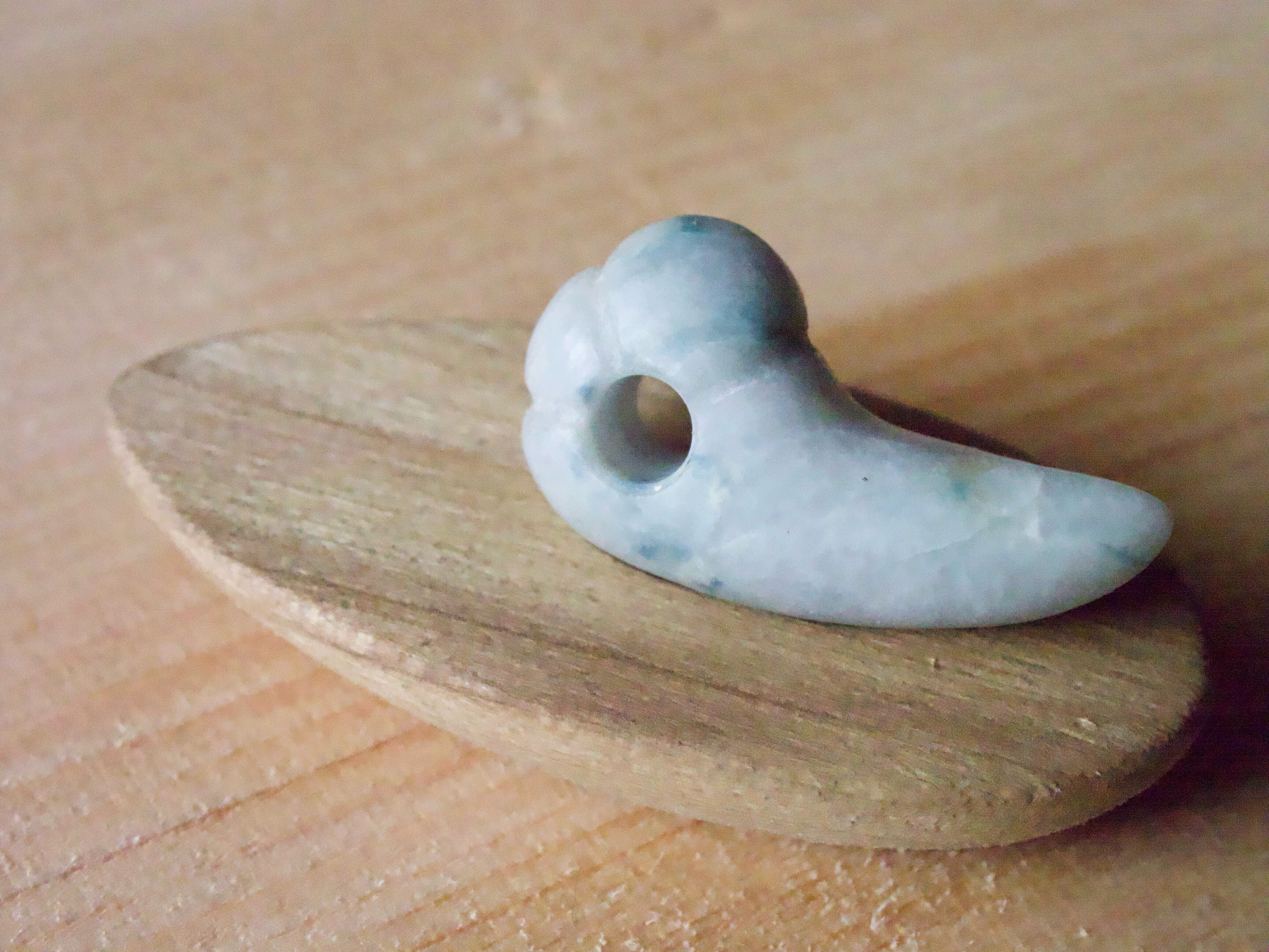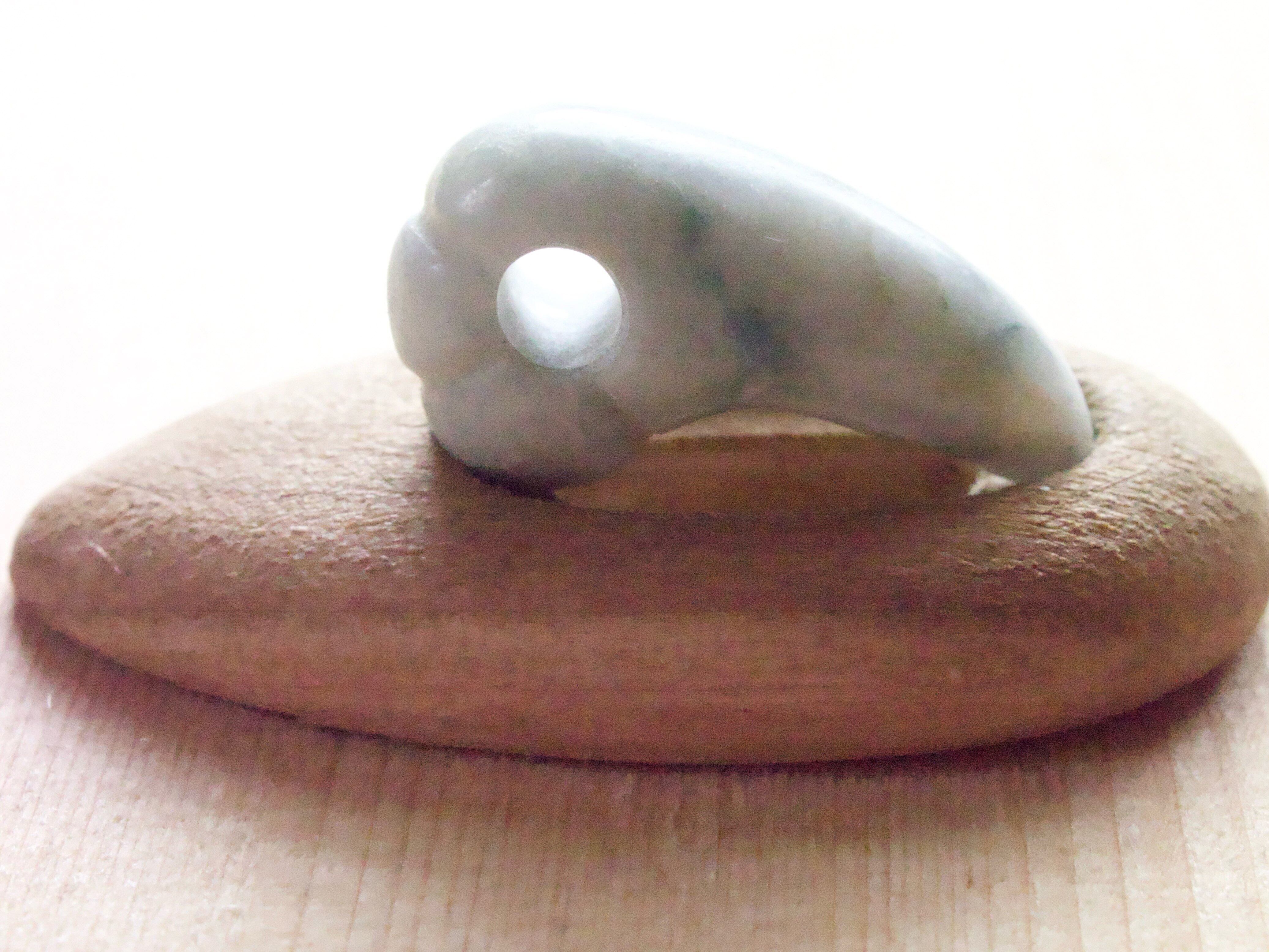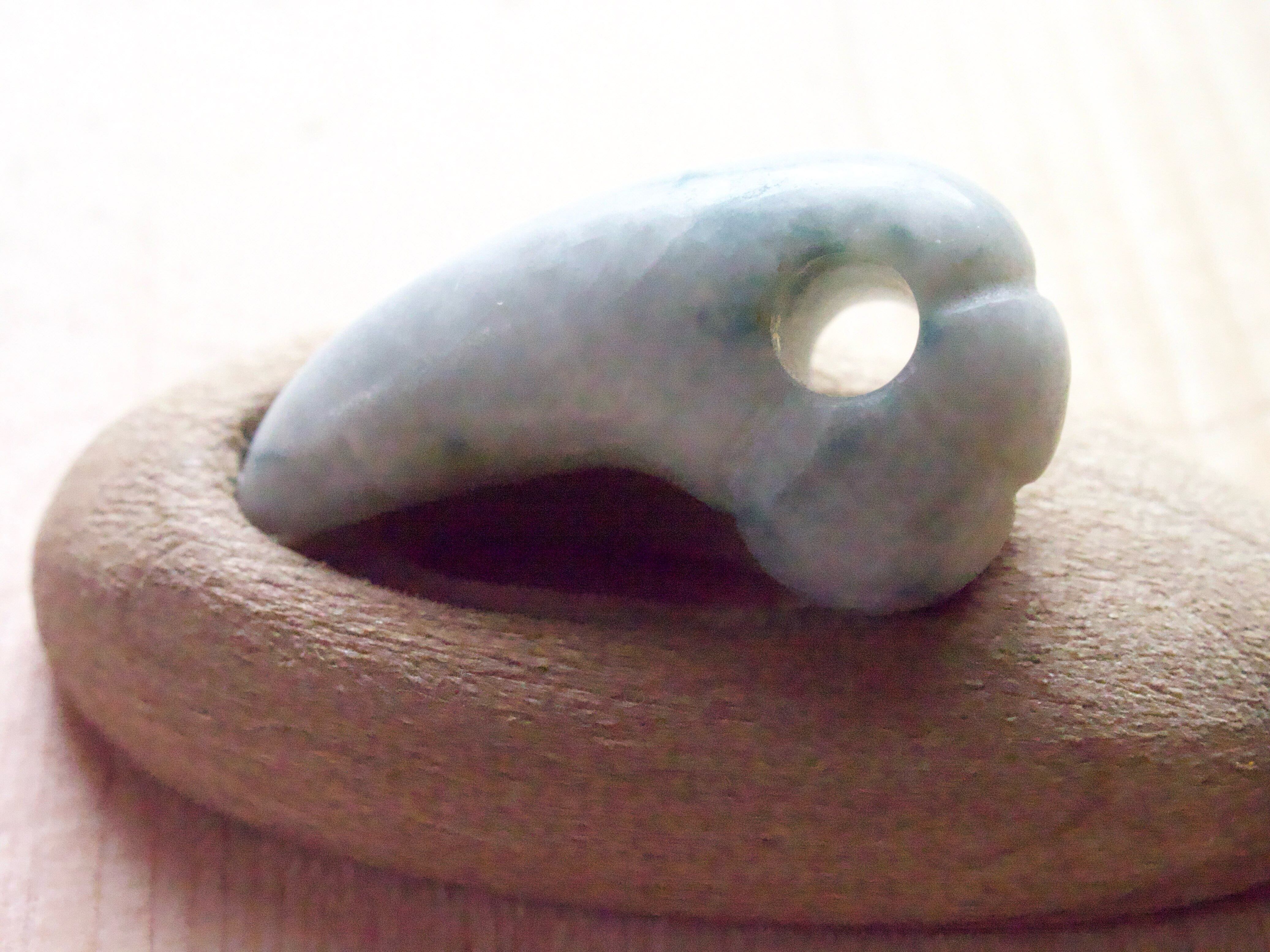 なんだか心が静まるような落ち着いた 色合いの翡翠。 灰白ベースに変わった青い模様が なんとも言えません。 可愛くキレのある形に仕上がりました。 富山在住の翡翠加工の熟練者の方から 譲り受けて制作しました。 サイズ縦19.5mm横10.5mm厚み7mm
