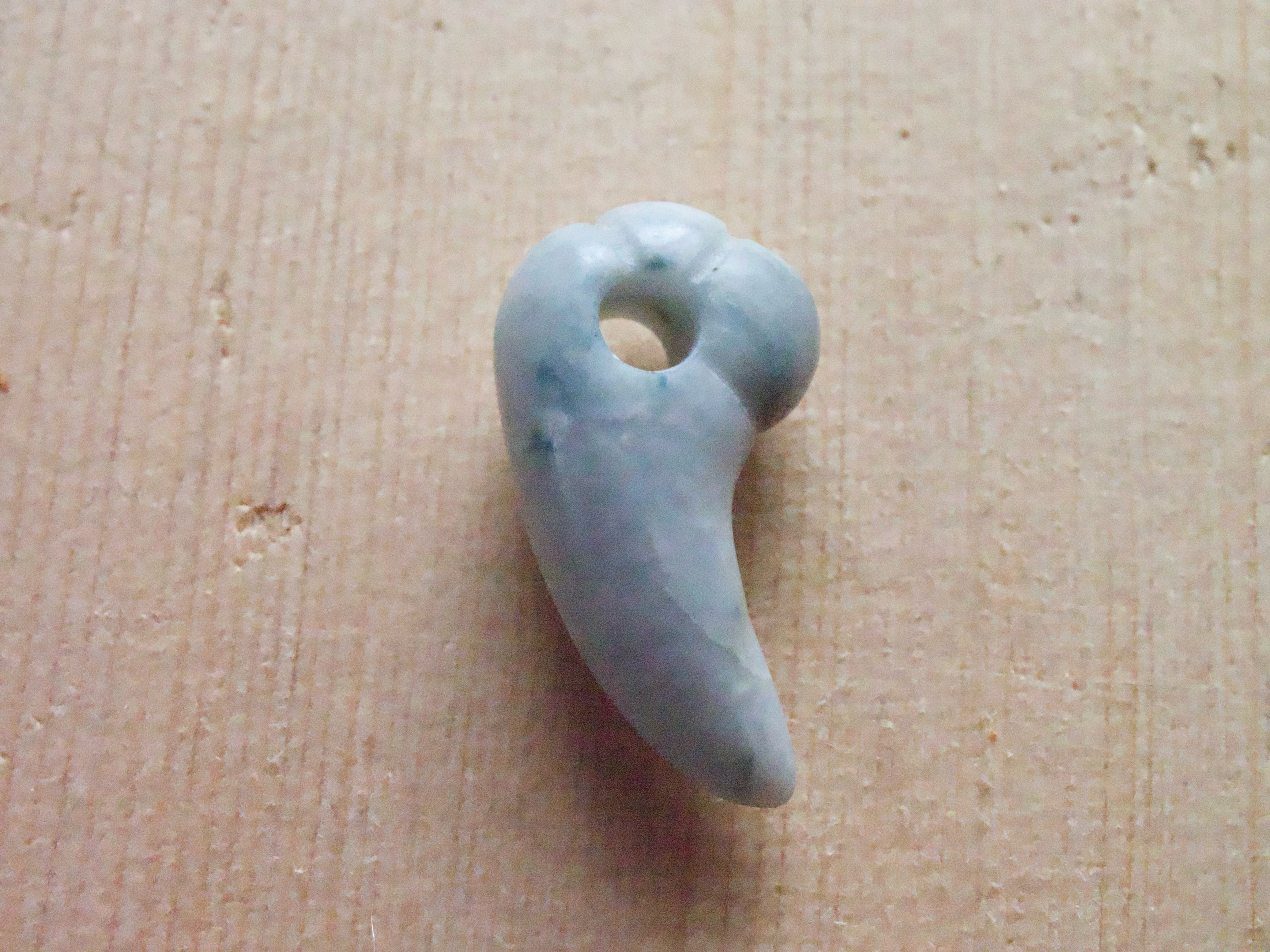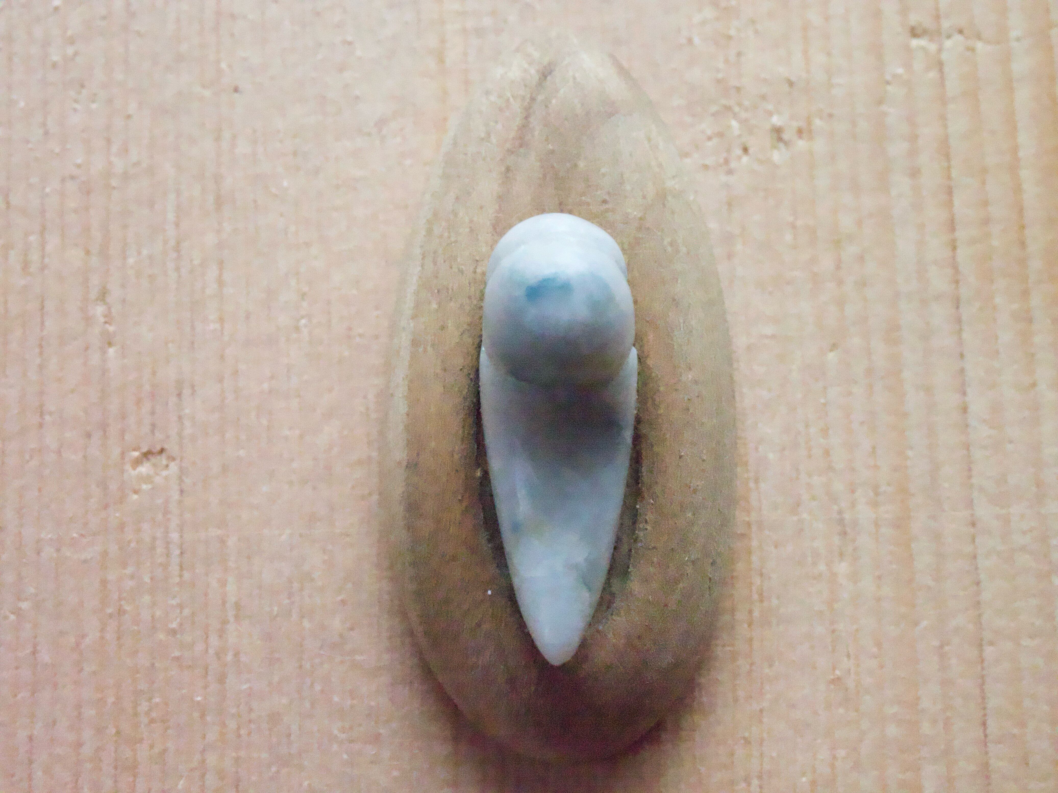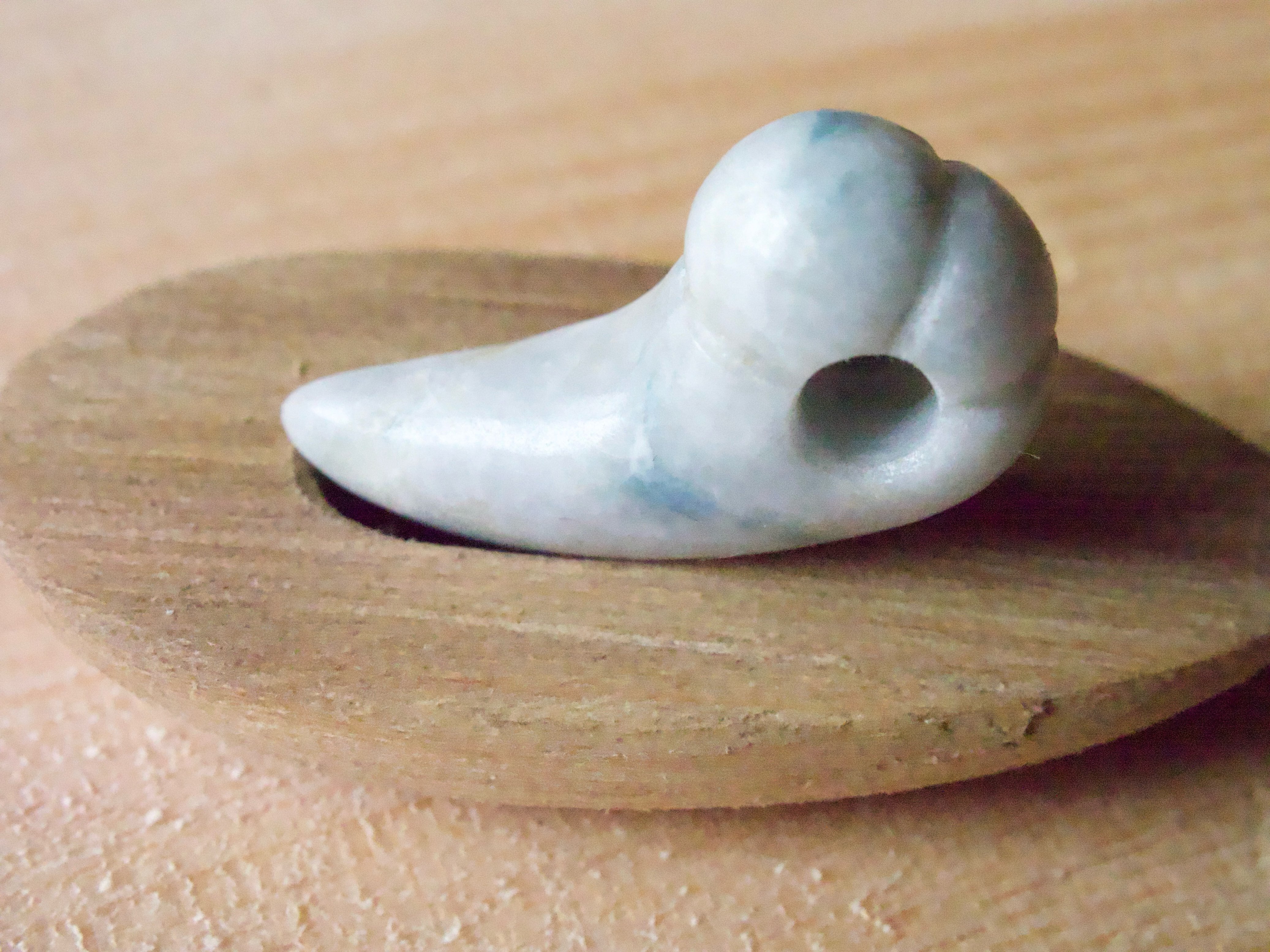 なんだか心が静まるような落ち着いた 色合いの翡翠。 灰白ベースに変わった青い模様が なんとも言えません。 可愛くキレのある形に仕上がりました。 富山在住の翡翠加工の熟練者の方から 譲り受けて制作しました。 サイズ縦19.5mm横10.5mm厚み7mm